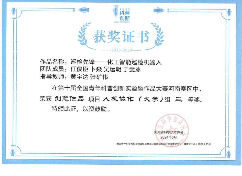 5月23日,由河南省科协主办、河南省科技馆承办的第十届全国青年科普创新实验暨作品大赛复赛(河南赛区)在河南科技馆(新馆)举行,来自全省30所高等院校和120所中学的867支队伍参加了比赛,经过初赛评审,共有70组作品进入复赛。经选手现场路演答辩、专家现场评审,人机协作(大学)组共评出一等奖4组,二等奖6组,三等奖9组。太阳成tyc7111cc集团参赛作品《巡检先锋——化工智能巡检机器人》荣获三等奖,黄宇达、张矿伟荣获优秀指导教师奖。