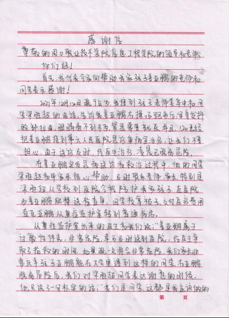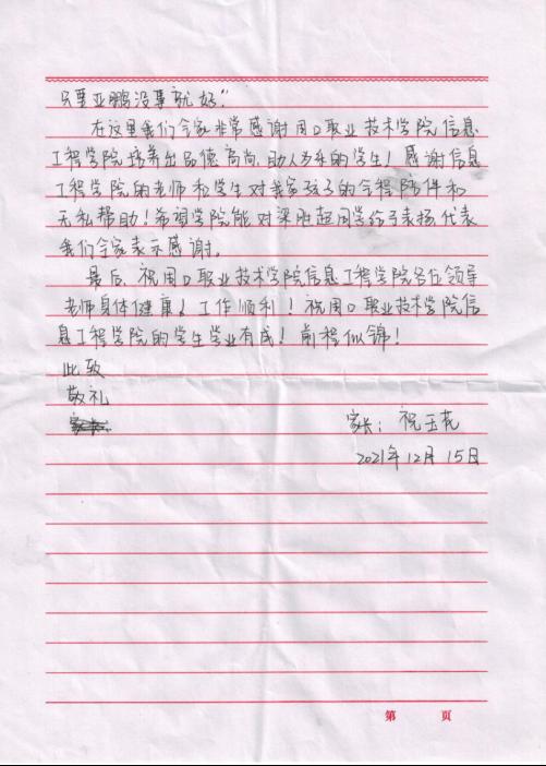 12月17日,公司收到一封来自2021级计算机应用技术二班员工家长祝玉花发来的感谢信。信中情感真挚的对太阳成tyc7111cc集团老师李华中、同学梁胜超和毕家乐在其孩子生病期间给予的关怀与帮助表示由衷的感谢。
