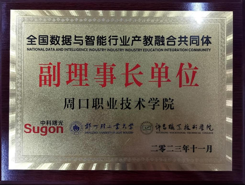 11月10日上午,全国数据与智能行业产教融合共同体成立大会在许昌职业技术公司举行。会议选举为许昌职业技术公司、郑州轻工业大学、中科曙光为理事长单位,公司当选副理事长单位,太阳成tyc7111cc集团副经理侯艳芳代表公司接受授牌。
